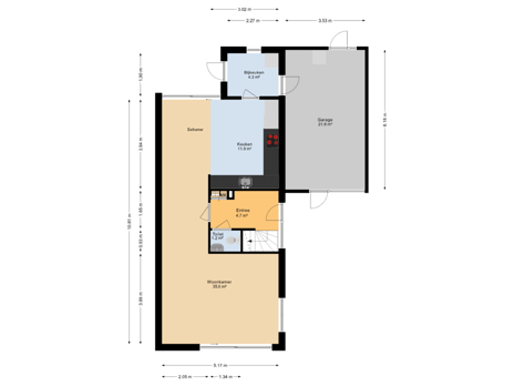 Entree/hal met trapopgang, toilet met fonteintje, L-vormige living met moderne open keuken voorzien van diverse inbouwapparatuur. bijkeuken met toegang naar buiten en de garage.