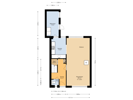 Begane grond: hal/entree, toilet, trapkast, lichte woonkamer met houtkachel en vrij uitzicht op openbaar groen en de achtertuin, open keuken (samen 36 m²), grote bijkeuken (7,5 m²) met achteringang.