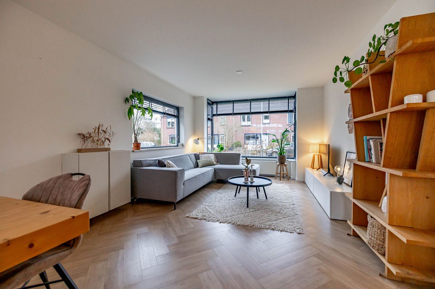 De begane grond kenmerkt zich door een lichte en ruime woonkamer met een erker aan de voorzijde, wat zorgt voor veel daglicht. De stijlvolle visgraatvloer geeft het geheel een moderne en luxe uitstraling. Aan de achterzijde bieden de openslaande deuren direct toegang tot de tuin, waardoor binnen en buiten mooi in elkaar overlopen. De diepe achtertuin biedt veel privacy en een vrij uitzicht. Naast de garage is recent een nieuwe overkapping geplaatst, ideaal voor beschut buiten zitten. De garage zorgt voor voldoende opslagmogelijkheden.
