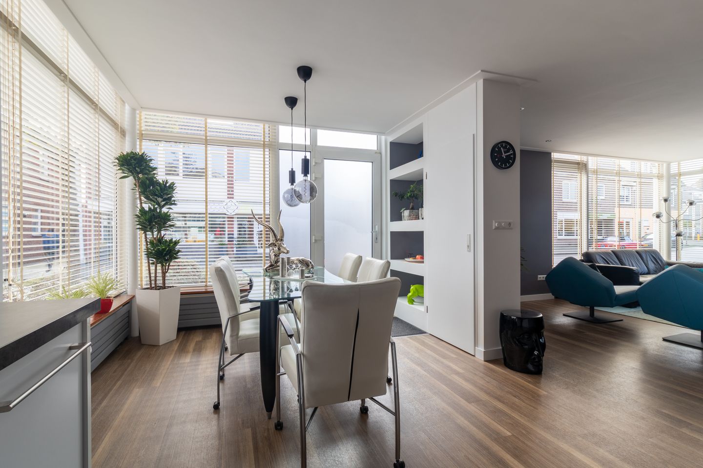 Door de vele raampartijen is de ruime woonkamer heerlijk licht. De sfeervolle planken creëren een subtiele, semi-open scheiding tussen de zit- en eethoek. Aansluitend tref je de keuken, welke is uitgevoerd in een L-vorm met hoogglans witte kasten en een donker blad. De nette keuken is voorzien van een koelkast, combi-oven, vaatwasser, een 4-pits inductie kookplaat en een afzuigkap.