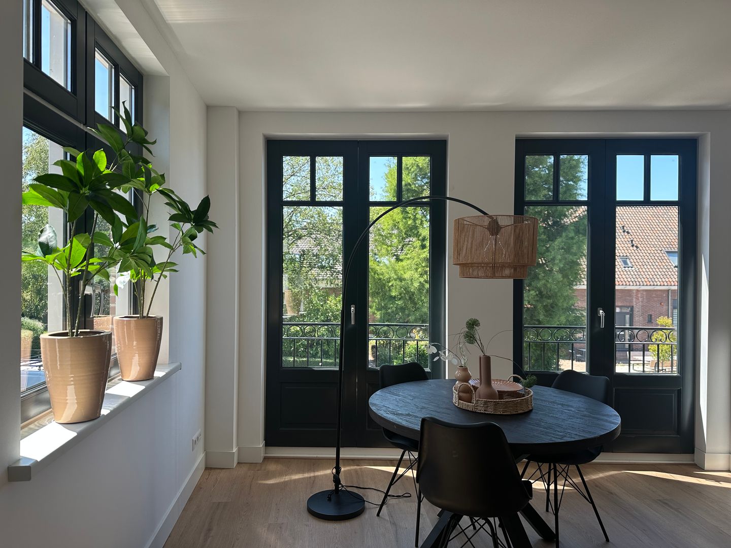 De woonkamer valt op door de vier openslaande deuren met Franse balkons, waardoor het daglicht rijkelijk binnenvalt en je vanaf de eind van de middag tot ’s avonds laat heerlijk in de zon kunt zitten. Zie jij jezelf al zitten in de avondzon bij de openslaande deuren, of juist lekker koel in de zomer dankzij de airco?