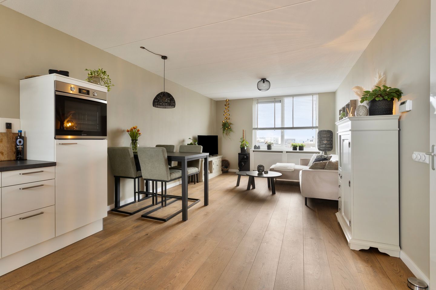 Dan door naar de woonkamer, die net als de hal voorzien is van een fraaie houten vloer. Vanaf de zithoek kijk je uit op de iconische Watertoren. Door de L-vormige keuken wordt de ruimte goed benut en is een open keuken gecreëerd. De keuken heeft witte keukenkastjes en een donkergrijs blad en je kijkt vanachter het aanrecht uit op het gezellige Noordplein. Ook de keuken is in 2023 volledig vernieuwd. De slaapkamer is gelegd met laminaat.