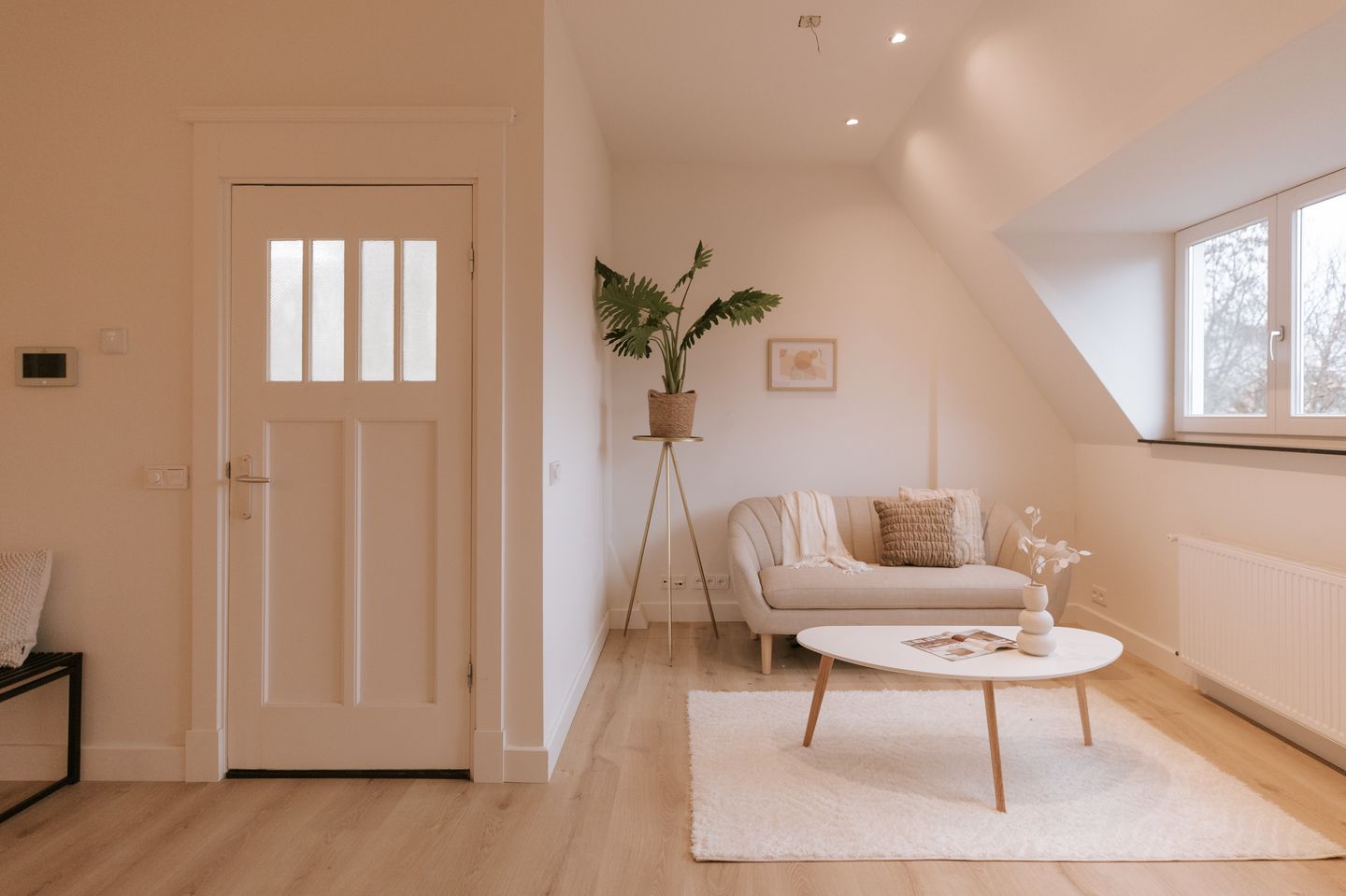 De entree met laminaatvloer geeft toegang tot de slaapkamer en de badkamer en de trap loopt hier ook door naar de tweede verdieping. Aan de buitenzijde van de hal is er nog een bergkast: ideaal voor jassen, tassen en schoenen.