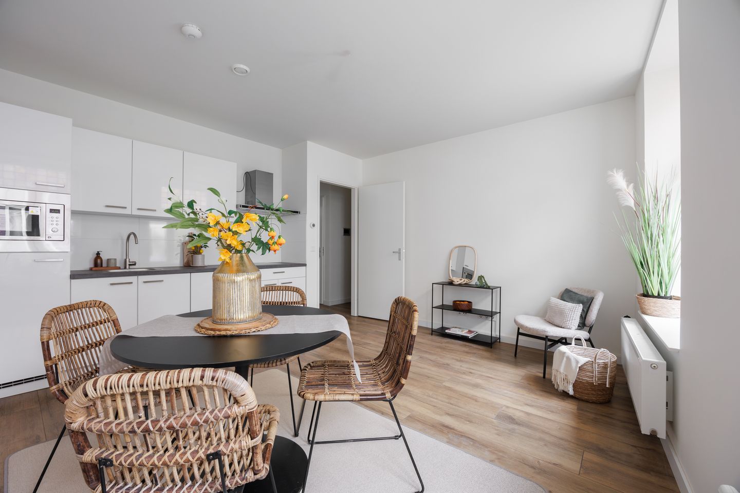 Dit appartement ligt op de eerste verdieping en aan de voorzijde. Het appartement kijkt dus fraai uit, over het winkelpubliek in de Hamstraat. Het appartement bereik je vanuit het atrium (de centrale binnenplaats), via een trapopgang naar de 1e verdieping. Je komt het appartement binnen in de hal, welke toegang geeft naar de woonkamer met open keuken, de 3 slaapkamers, de badkamer, het toilet en de berging. Het gehele appartement beschikt over een mooie vloer. De woonkamer met open keuken ligt aan de voorzijde en de moderne keuken beschikt over de volgende inbouwapparatuur: een kookplaat met afzuigkap, een magnetron, een koelkast en handige vaatwasser. De badkamer is betegeld en is voorzien van een douche en wastafel. Het toilet ligt apart en deze is eveneens betegeld. In de berging hangt de CV combiketel en hier is plaats voor de wasmachine. Het appartement beschikt over 3 slaapkamers, of een thuiswerkplek en 2 slaapkamers, al naar gelang jouw woonwensen. Mocht je de woonkamer willen vergroten, dan kun je de muur tussen het kantoor en de woonkamer verwijderen.