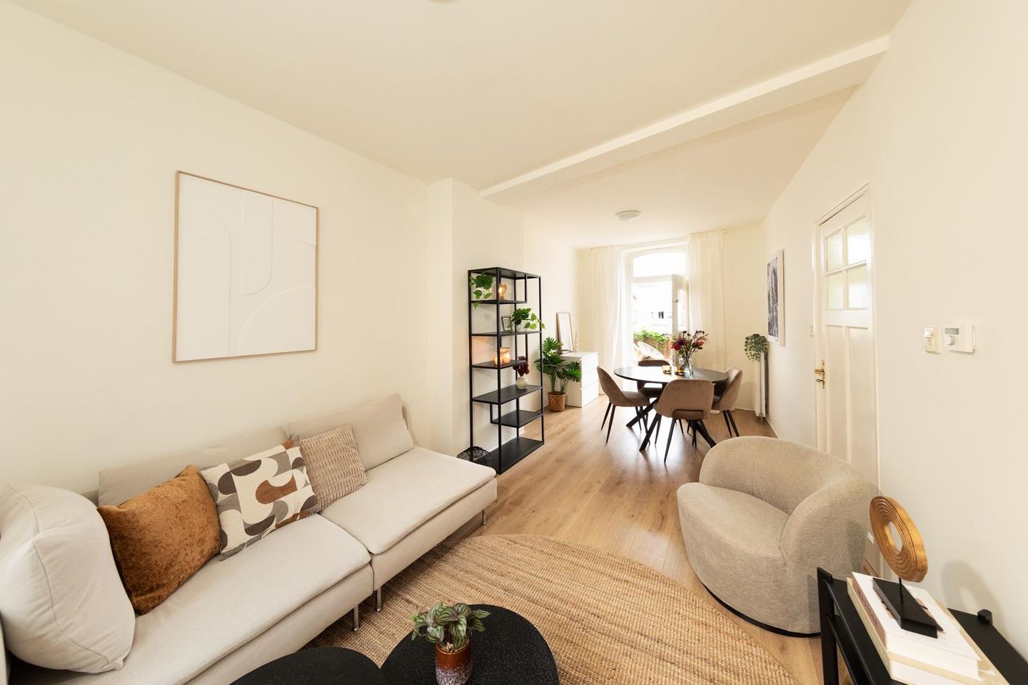Je komt binnen in de hal en vervolgens in de keuken en eetkamer. De sfeervolle keuken be-schikt over onder- en bovenkasten, een spoelelement, koelkast, vriezer en een combi magnetron. Vervolgens loop je door naar de woonkamer. De woonkamer is heerlijk licht door de grote raampartij en gezellige uitzicht op het monumentale pand en aan de andere zijde een royaal dakterras. Aan de overloop van de keuken grenst de badkamer en nog een slaapkamer. Het appartement is recentelijk gerenoveerd en voorzien van een mooie laminaatvloer.