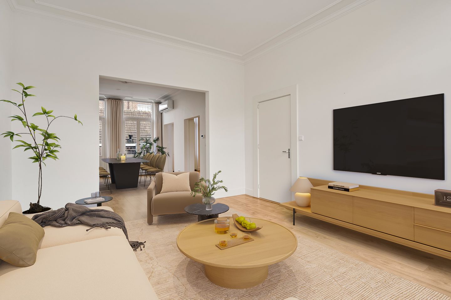 Op de eerste verdieping kom je binnen in een lichte en royale leefruimte. De woon- en eetkamer zijn prachtig afgewerkt met hoge plafonds, klassieke ornamenten en grote ramen die voor veel natuurlijk licht zorgen. Via openslaande deuren van woonkamer en keuken heb je toegang tot een riant dakterras – de ideale plek om te ontspannen of te genieten van een lekker drankje of eten in de buitenlucht. De open keuken is voorzien van een luxe kookeiland en moderne apparatuur, perfect voor de kookliefhebber. Aangrenzend vind je een handige bijkeuken met witgoedaansluitingen en een ruime extra berging waarin zich ook de meterkast bevindt. Aan de voorzijde van de woning bevindt zich een fijne werkkamer die ideaal is voor thuiswerken of als hobbyruimte. Uiteraard kan deze ruimte ook gebruikt worden als extra slaapkamer. Voor extra comfort is deze verdieping voorzien van airconditioning.