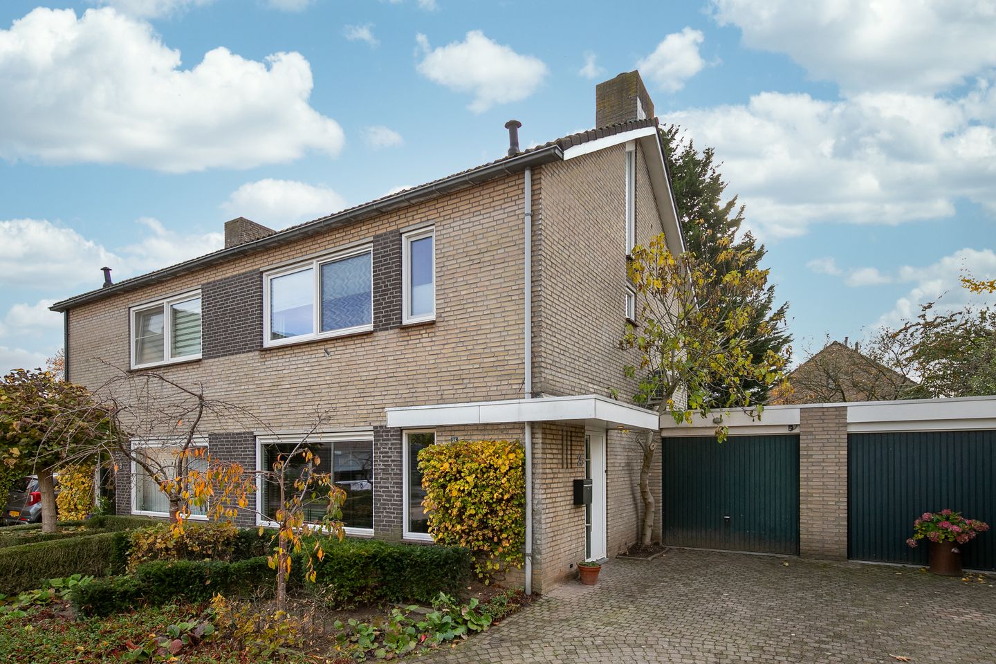 Aan de voorzijde van de woning vind je een aangebouwde stenen garage met elektra en water, ideaal voor fietsen, gereedschap of sportspullen. De ruime oprit biedt bovendien plek aan meerdere auto’s, zodat bezoek altijd makkelijk kan parkeren.