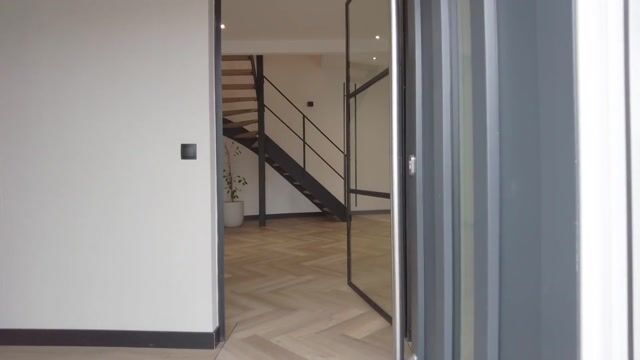 Via de overdekte entree betreed je de woning in de hal met meterkast. Een elegante taatsdeur geeft toegang tot de leefruimte, waar direct de rustige en bijna klassieke uitstraling opvalt. De visgraatvloer vormt een warme en stijlvolle basis en loopt naadloos door over de gehele ruimte.