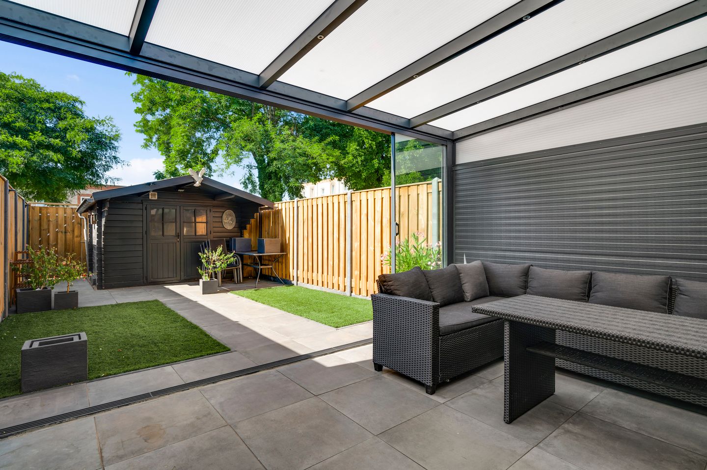 De woning beschikt over een fraai aangelegde, onderhoudsvriendelijke tuin op het zuiden. Hier geniet je de hele dag van de zon. Het terras onder de overkapping maakt het mogelijk om ook tijdens warme zomers of lichte regenbuien buiten te zitten. Achter in de tuin bevindt zich een ruime tuinberging en een eigen achterom.