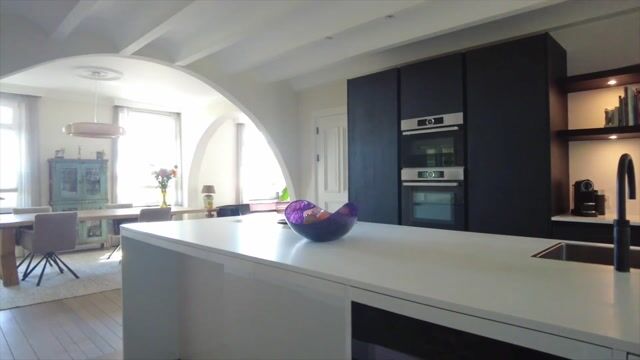 De luxe leefkeuken (ca. 19,2 m²) is een plek waar gekookt, gelachen en geleefd wordt. Er is een royaal schiereiland met composiet blad, hoogwaardige inbouwapparatuur (o.a. Bora-kookplaat met geïntegreerde afzuiging, vaatwasser, wijnklimaatkast). In de kastenwand beschik je over een koelkast met diepvriesvak, combioven en stoomoven. De combinatie van warme materialen, moderne lijnen en praktische indeling maakt deze ruimte een genot om in te koken én te verblijven. Vanuit de keuken heb je toegang tot de praktische provisiekelder (ca. 8,8 m²) en tot het portaal, dat toegang biedt tot de achterbouw.