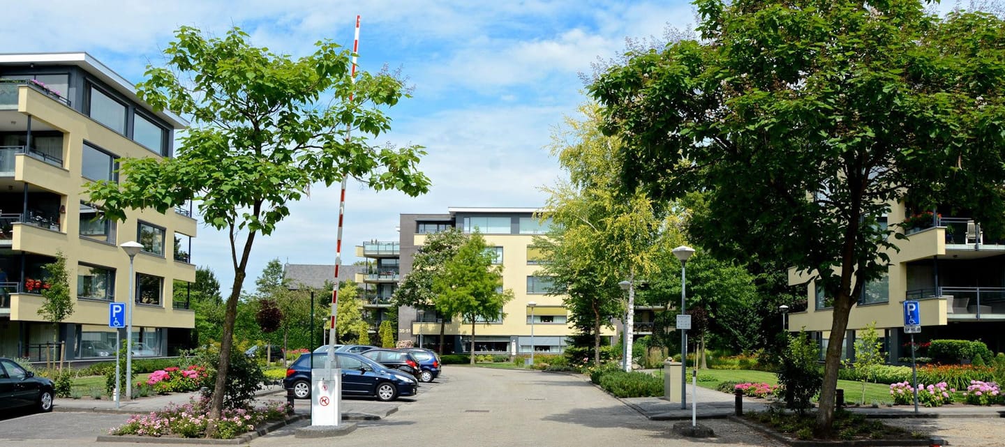 Via 2 achteruitgangen krijgt u toegang tot het parkeerterrein welke door de beplanting en bestrating volkomen opgaat in de prachtige aangelegde parktuin. Een prive parkeerplaats is hier aanwezig en ook in geval van dit appartement ligt deze direct bij de uitgang van het gebouw. De tuin welke professioneel wordt onderhouden is voorzien van diverse beplanting, een vijver en een stukje bos met diverse wandel- en zit mogelijkheden. Hier is het in elk jaargetijde heerlijk toeven.