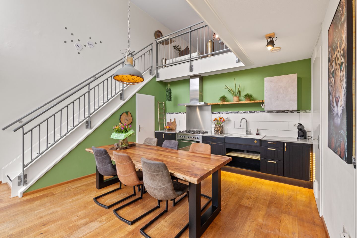 De woonkeuken is een verbluffende ruimte en vormt dankzij de hoge plafonds, de riante vide, de grote raampartij en de sfeervolle afwerking het hart van het huis. Dit is dé plek om de dag goed te beginnen met een uitgebreid ontbijt of om te borrelen en dineren met vrienden en/of familie. Door de royale afmetingen plaats je hier eenvoudig een 6-persoons eettafel, zonder dat dit ten koste gaat van de loopruimte.