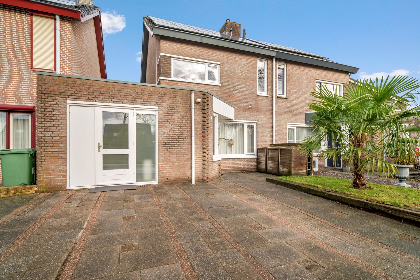 De voortuin is onderhoudsvriendelijk aangelegd met borderbeplanting, een opvallende palmboom en een dubbele oprit voor twee auto’s, wat parkeren ideaal maakt.