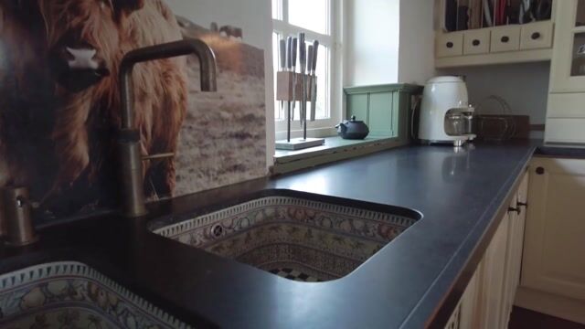 De keuken is praktisch ingedeeld en biedt volop ruimte om gezellig samen te zijn met partner, gezin, familie of vrienden. De vloer is afgewerkt met tegels voorzien van comfortabele vloerverwarming, terwijl de wanden strak zijn gestuct. Het plafond is smaakvol uitgevoerd met lambrisering en houten balken, wat de ruimte extra karakter geeft. Het centraal geplaatste kookeiland vormt een fijne en ruime werkplek. De keuken is uitgerust met een dubbele spoelbak met Quooker kraan en met een breed SMEG fornuis met een 5-pits inductiekookplaat en drie ovens: een heteluchtoven, een oven/grill en een oven/bordenwarmer.