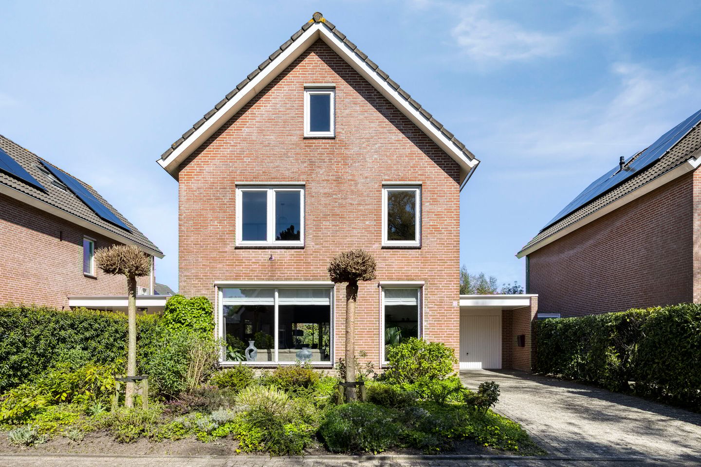 Ook de voortuin is netjes en groen ingericht. Via de oprit bereik je de ruime garage, die bovendien toegang biedt tot de achtertuin.
