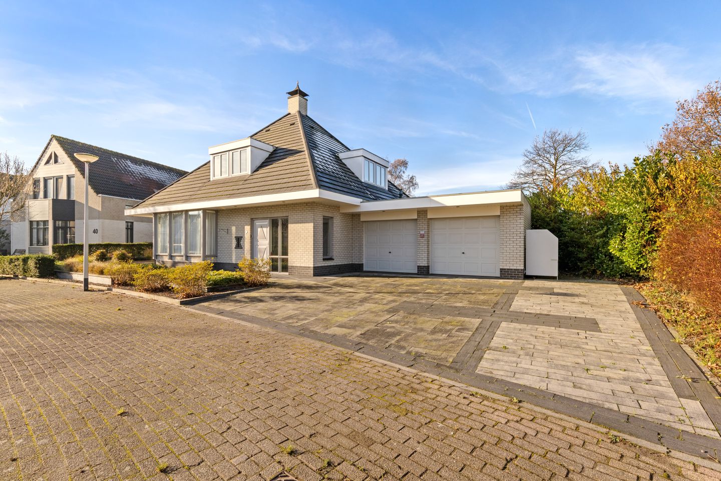 - Vrijstaande woning op een hoekperceel met dubbele garage en grote oprit voor meerdere auto's.