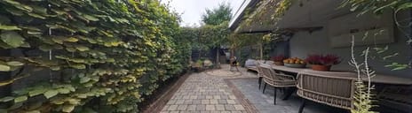 Wat een leuke, diepe achtertuin heeft deze woning. De kinderen en huisdieren kunnen hier heerlijk spelen. De achtertuin is netjes aangelegd en onderhouden. Ook is er een tuinhuis geplaatst.
