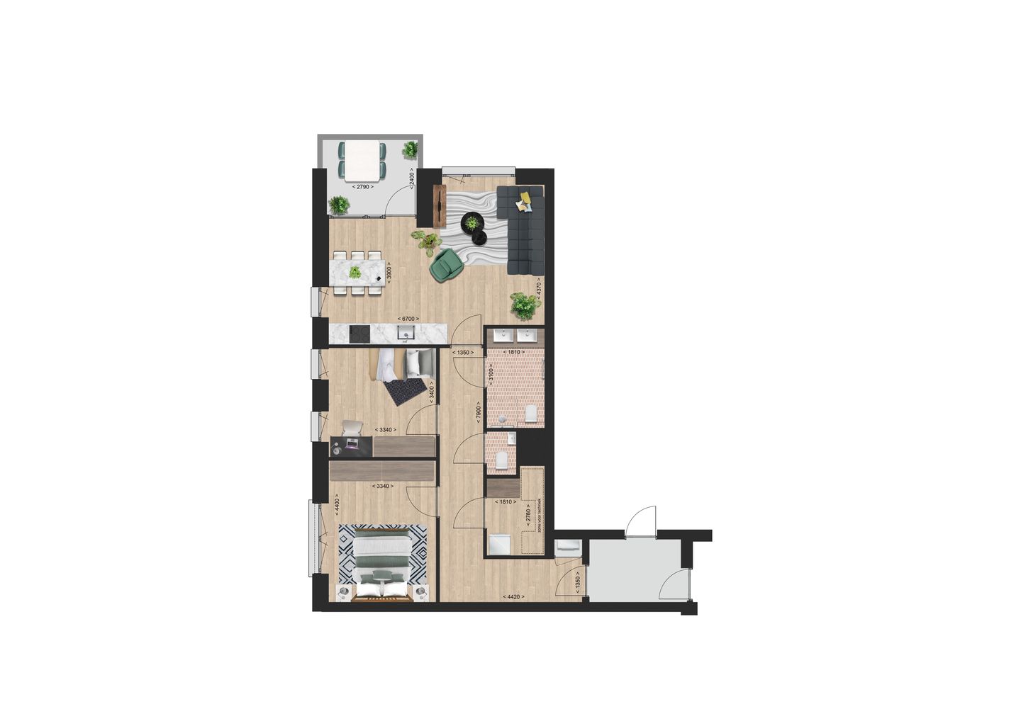 De appartementen hebben 2 of 3 slaapkamers en variëren in gebruiksoppervlakte van 68 tot 105 m2. De woonkamer met open keuken geeft toegang tot een heerlijk balkon of terras met uitzicht op de tuin of de groene omgeving. Op de begane grond is dat een terras en op de eerste en tweede verdieping een balkon. In het appartement heb je een ruime eigen berging en op de begane grond is er een algemene fietsenberging. Je auto parkeer je op je eigen parkeerplaats of één van de vrije plaatsen op het verlichte terrein rondom het gebouw.