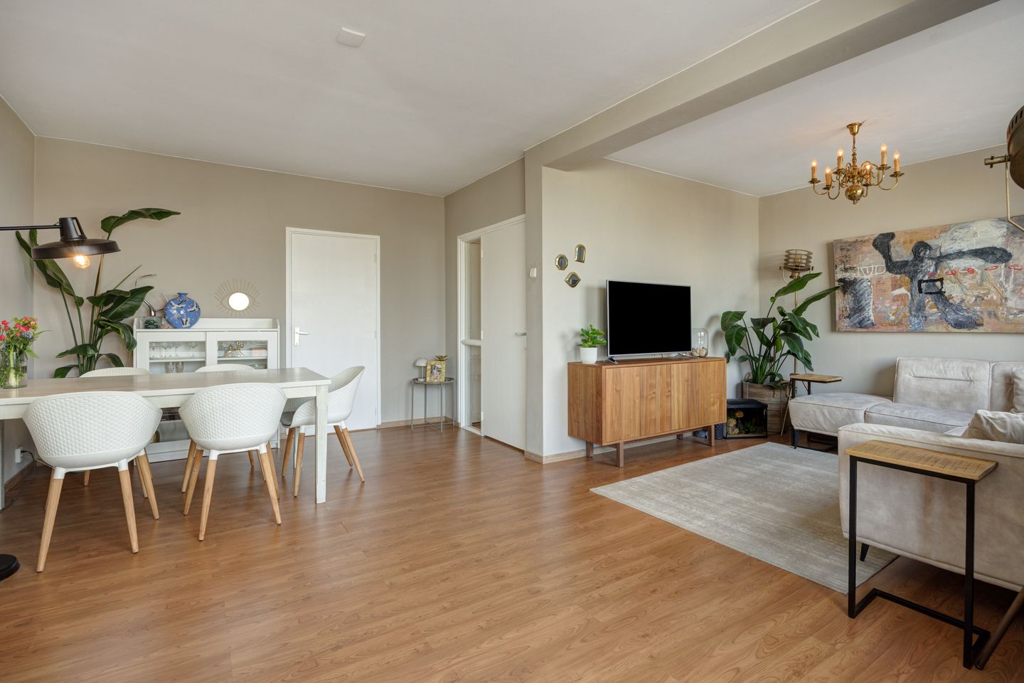 Het appartement is afgewerkt met een laminaatvloer en glad stucwerk wand- en plafondafwerking.