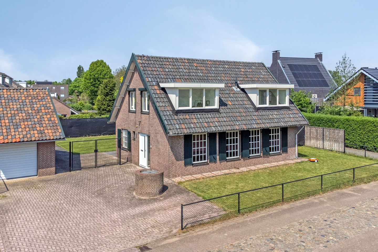 Via een dubbel hek bereik je de brede oprit, met plek voor maar liefst drie auto’s. De garage is voorzien van een elektrische roldeur én een doorgang naar de tuin. Achter de garage is een aanbouw met een fraaie overkapping en glazen pui – een heerlijke plek om buiten te zitten, ongeacht het seizoen.