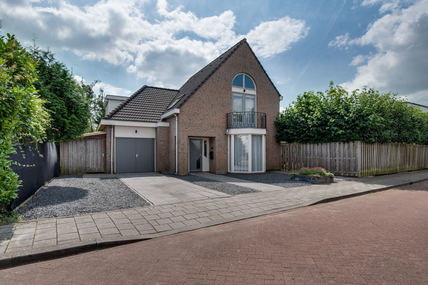 De ruime voortuin is voorzien van sierbestrating, siergrind en parkeergelegenheid voor meerdere auto's op eigen terrein. Naast de voormalige garage is een ruime houten berging met elektra geplaatst.