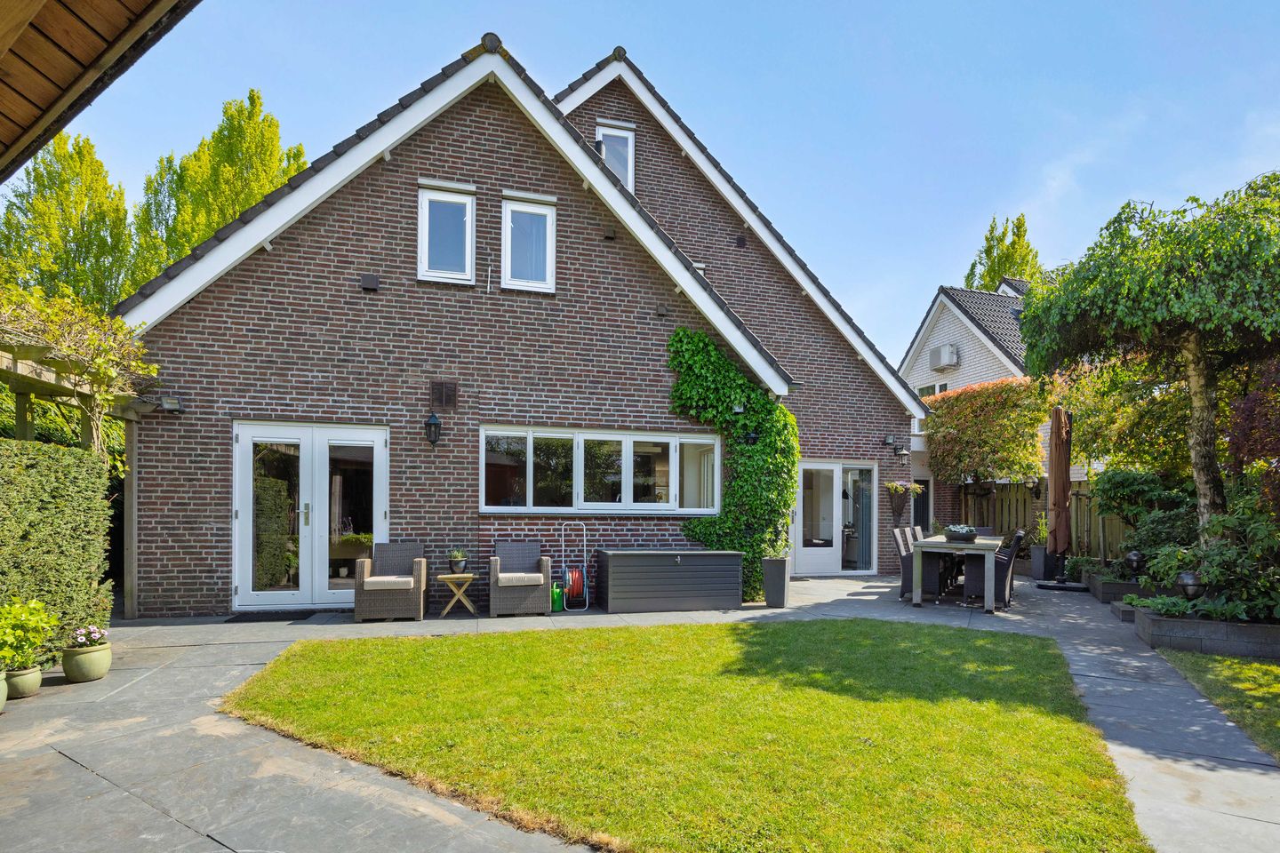 De fraai onder architectuur aangelegde achtertuin is op het noordwesten georiënteerd en biedt ieder moment van de dag wel ergens in de tuin een plekje in de zon. De tuin is aangelegd met meerdere terrassen, een prachtige overkapping, gazon, volwassen beplanting, houten berging, groene omheining en een achterom. Door de wijze waarop de tuin is aangelegd, is er sprake van optimale privacy. Een ware oase van rust.