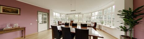 Aansluitend aan het zitgedeelte ligt het eetgedeelte met royale serre, in totaal meet deze ruimte 43m². Hier is meer dan voldoende plaats voor een flinke eethoek waaraan gezellig getafeld kan worden met een groter gezelschap. De serre geeft een mooie doorkijk en de tuindeuren in de serre zorgen voor directe toegang tot het terras en de ruime achtertuin.