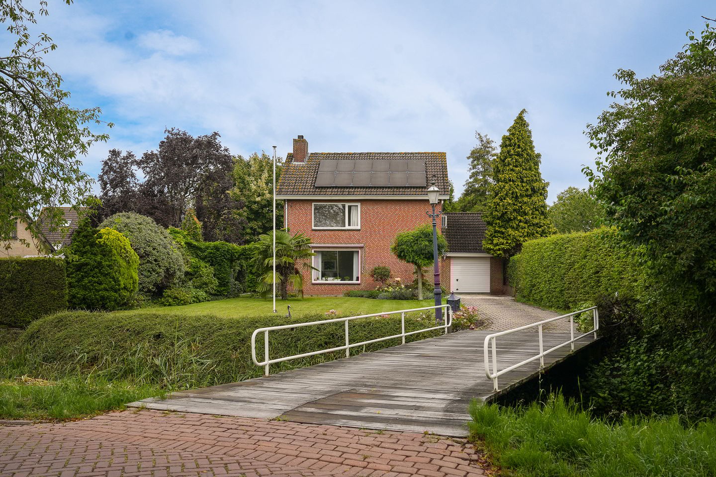 De entree van het perceel wordt gemarkeerd door een karaktervolle houten brug met witte leuningen op donkere balken, in eigendom van de woning. Direct langs het perceel stroomt het water van de Wetering, een idyllische aanvulling op de landelijke ligging.