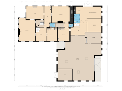 Vanuit de keuken loop je naar de bijkeuken aan de voorzijde van de woning. Deze heeft een eigen ingang vanaf de zijde van de oprit. Van hieruit kom je in de hal die toegang geeft tot het gastenverblijf, de stallingsruimte, de kapschuur en de opgang naar de kantoorruimte.