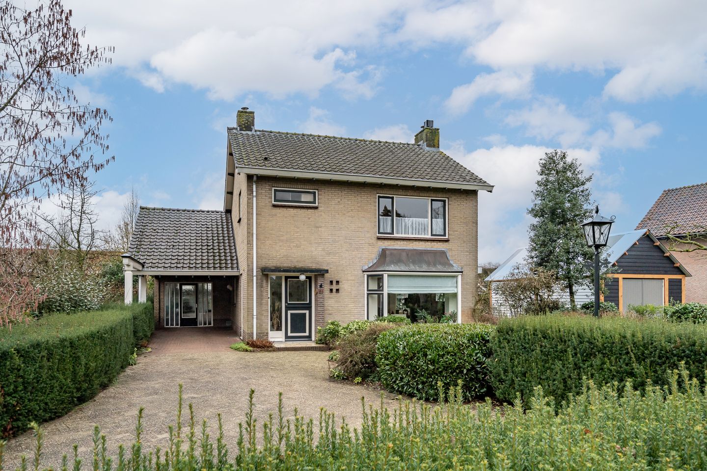 Via de ruime oprit bereikt u de woning met carport en de aangebouwde praktijkruimte met eigen entree. Deze multifunctionele ruimte leent zich uitstekend voor uiteenlopende doeleinden, zoals een kantoor aan huis, atelier of hobbyruimte.