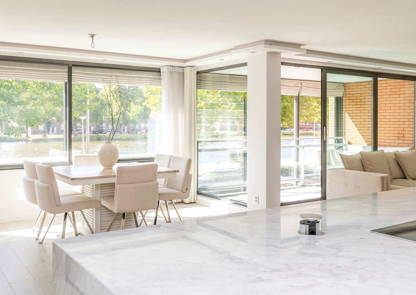 Een uniek gelegen, ruim en heerlijk licht drie-kamerappartement (voorheen vier kamers) met balkon/serre en een fenomenaal uitzicht over het vaarwater!