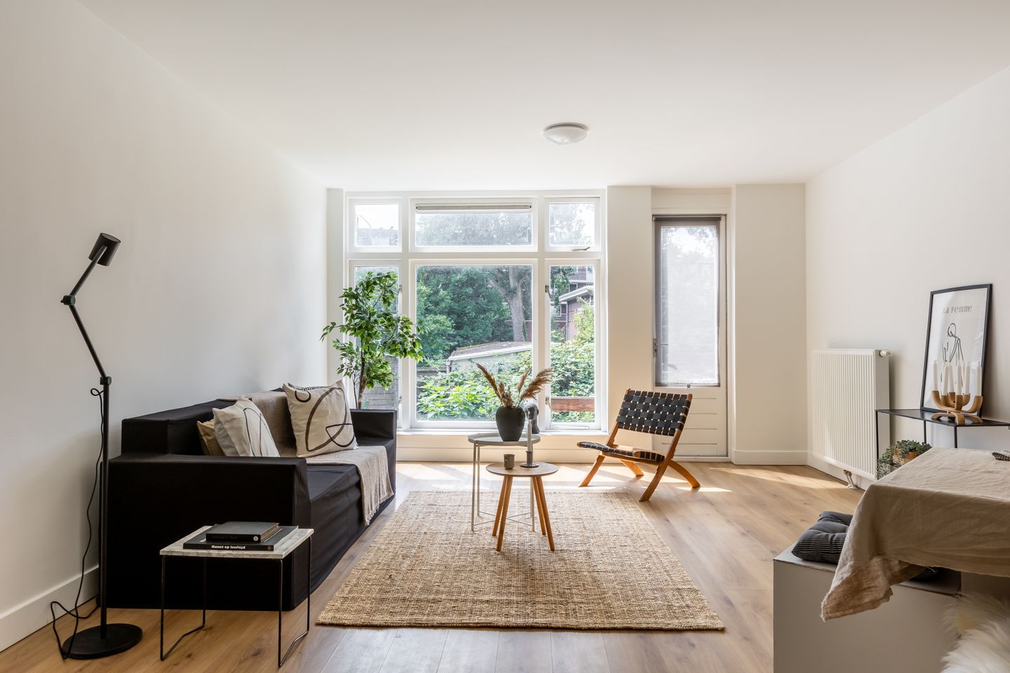 Je komt binnen via je eigen voordeur aan de voorzijde van de woning. Vanuit de hal stap je de lichte en ruime woonkamer binnen. De strakke afwerking, het grote raam aan de voorzijde en de strakke vloer geven het geheel een warme, moderne uitstraling. Er is een open keuken aanwezig met veel kastruimte en diverse inbouwapparatuur, zoals een oven, gaskookplaat, afzuigkap, vaatwasser, koelkast en vriezer. Via een deur in de woonkamer stap je zo het balkon op, dat dankzij een trap verbonden is met de tuin (ca. 42 m²) – perfect voor zomeravonden! Ook bevindt zich op deze verdieping een fijne slaapkamer, ideaal als werkkamer, logeerkamer of voor wie gelijkvloers wil slapen. De trap in de woonkamer brengt je naar het souterrain.