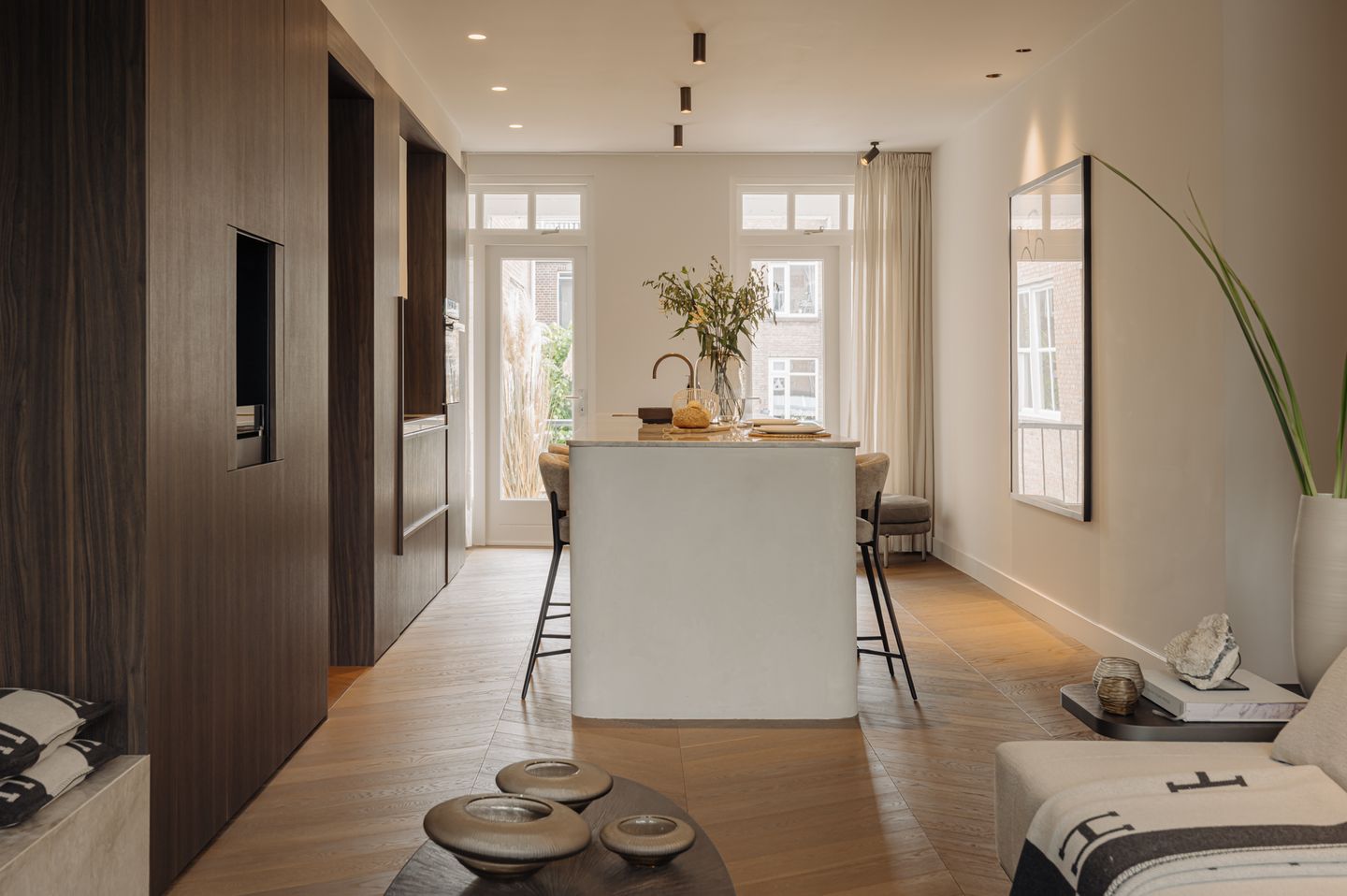 Perfectie tot in detail. Van de Hongaarse punt parketvloer met vloerverwarming tot het kwartsieten werkblad in de maatwerk keuken. Dit is geen huis dat je moet opknappen. Dit is een woning die af is. Echt af.