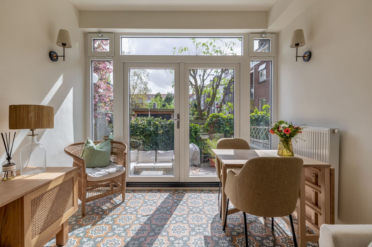 De woonkamer is een fijne plek waar je meteen ziet wat deze woning zo aantrekkelijk maakt. Door de grote raampartijen en de openslaande deuren naar de tuin valt het daglicht rijkelijk naar binnen. Het voormalige balkon is bij de woonkamer gevoegd, wat zorgt voor extra leefruimte en een prettig open gevoel. Hier heb je alle ruimte voor een gezellige zithoek én een eettafel.