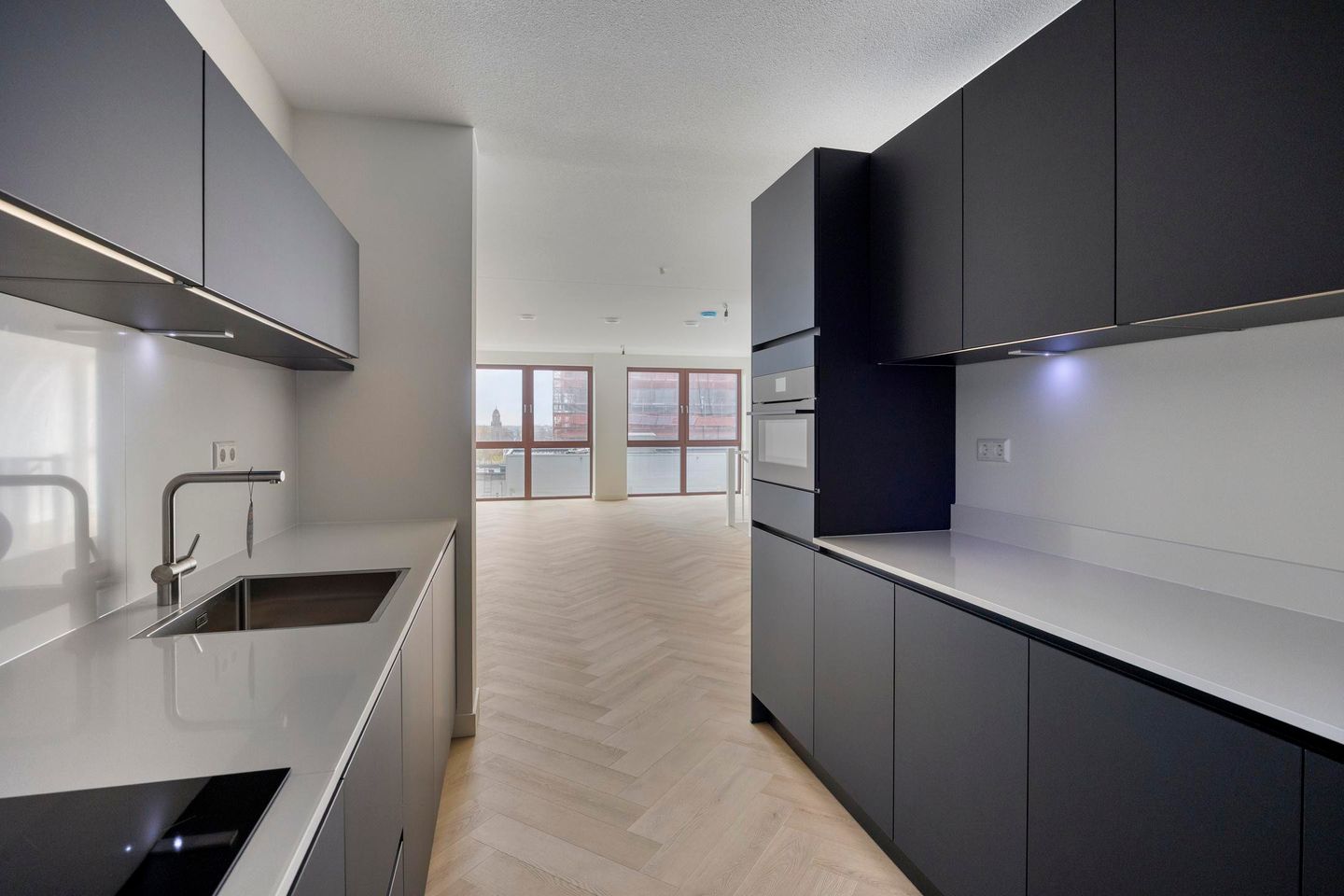 Op de achtste verdieping bevindt zich het royale leefgedeelte van circa 48 m², met aansluitend een compleet nieuwe moderne en zeer luxe keuken van circa 9 m². De keuken is volledig uitgerust met hoogwaardige AEG-inbouwapparatuur, waaronder een oven, vaatwasser en koel-vriescombinatie. Daarnaast is er gekozen voor een moderne BORA-kookplaat met geïntegreerd afzuigsysteem, wat zorgt voor een strakke uitstraling en extra kookcomfort. Koken, relaxen en samen genieten vloeien hier moeiteloos in elkaar over. De grote raampartijen zorgen voor een prachtige lichtinval, terwijl het indrukwekkende uitzicht over de stad elke dag opnieuw het perfecte decor vormt. Aan opbergruimte geen gebrek: op deze verdieping vind je bovendien een separate berging van circa 7 m². Daarnaast is er een extra inpandige berging met aansluitingen voor de wasmachine en droger én de opstelplaats voor de WTW-installatie praktisch en netjes uit het zicht.