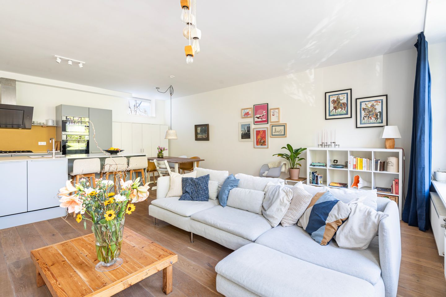 De woonkamer met vaste kast (CV-opstelling) biedt diverse mogelijkheden voor het creëren van een comfortabel zitgedeelte. De aanwezige verhoging zorgt voor een speelse indeling en geeft de ruimte extra karakter. Door de grote raampartijen aan de voorzijde treedt er veel natuurlijk licht de woning in wat zorgt voor een fijne, lichte sfeer. De moderne keuken is opgezet rondom een kookeiland met barretje, een mooie plek waar koken en gezelligheid samenkomen. De open keuken beschikt over diverse soorten inbouwapparatuur zoals een vaatwasser, oven, 5-pits gasfornuis met afzuigkap, 2 ovens en een koel-/vriescombinatie.