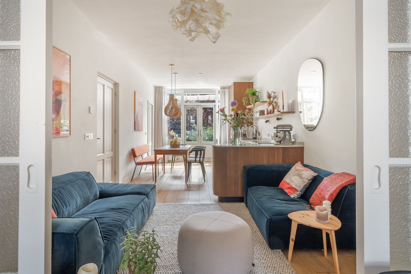 Hal/entree met tochtportaal, meterkast en toegang tot woonkamer. De woonkamer is gelegen aan de achterzijde van de woning en loopt vloeiend over in de moderne open keuken. De prachtige houten keuken is voorzien van diverse inbouwapparatuur zoals een inductie kookplaat met afzuiging, oven, vaatwasmachine en koel-/vriescombinatie. Door de royale opzet is er voldoende plek voor een eettafel, waardoor je heerlijk kunt koken en tafelen tegelijkertijd. De keuken geeft toegang tot het terras, gelegen op het zonnige zuiden. Middels een kleine trap bereik je de zeer diepe achtertuin van 21 meter, welke een oase van rust en ruimte biedt. De tuin is tevens voorzien van een houten vlonder terras en een ruime vrijstaande berging. Perfect voor bijvoorbeeld tuinmeubilair, fietsen en gereedschap. Ook beschikt de tuin over een fantastisch tuinhuis die goed gebruikt worden als kantoor of logeerhuis. De woning beschikt over twee slaapkamers. De grootste slaapkamer ligt aan de voorzijde en is te bereiken middels de 2 schuifdeuren vanuit de woonkamer en vanuit de hal. De royale kamer beschikt over twee inbouwkasten, wat zorgt voor voldoende opbergruimte. De lichte kamer biedt tevens ook meer dan genoeg ruimte voor een 2-persoonsbed. De tweede slaapkamer bevindt zich aan de achterzijde en is te bereiken vanuit de eetkamer. De kamer kan goed functioneren als kinderkamer/werkkamer. Vanuit de kamer is ook toegang tot het terras. De badkamer is te bereiken vanuit de hal en is voorzien van een douche, dubbele wastafel met meubel en een toilet.