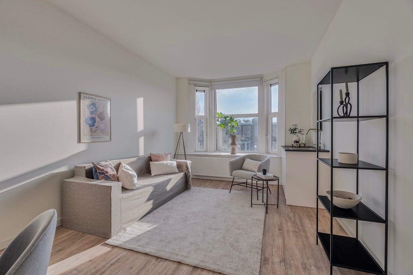 Via de trap bereik je de vierde verdieping, waar je beschikt over de voorste helft van de etage. Hier tref je een toffe, lichte slaapkamer met ruimte voor een groot tweepersoonsbed en voldoende plaats voor kledingkasten.