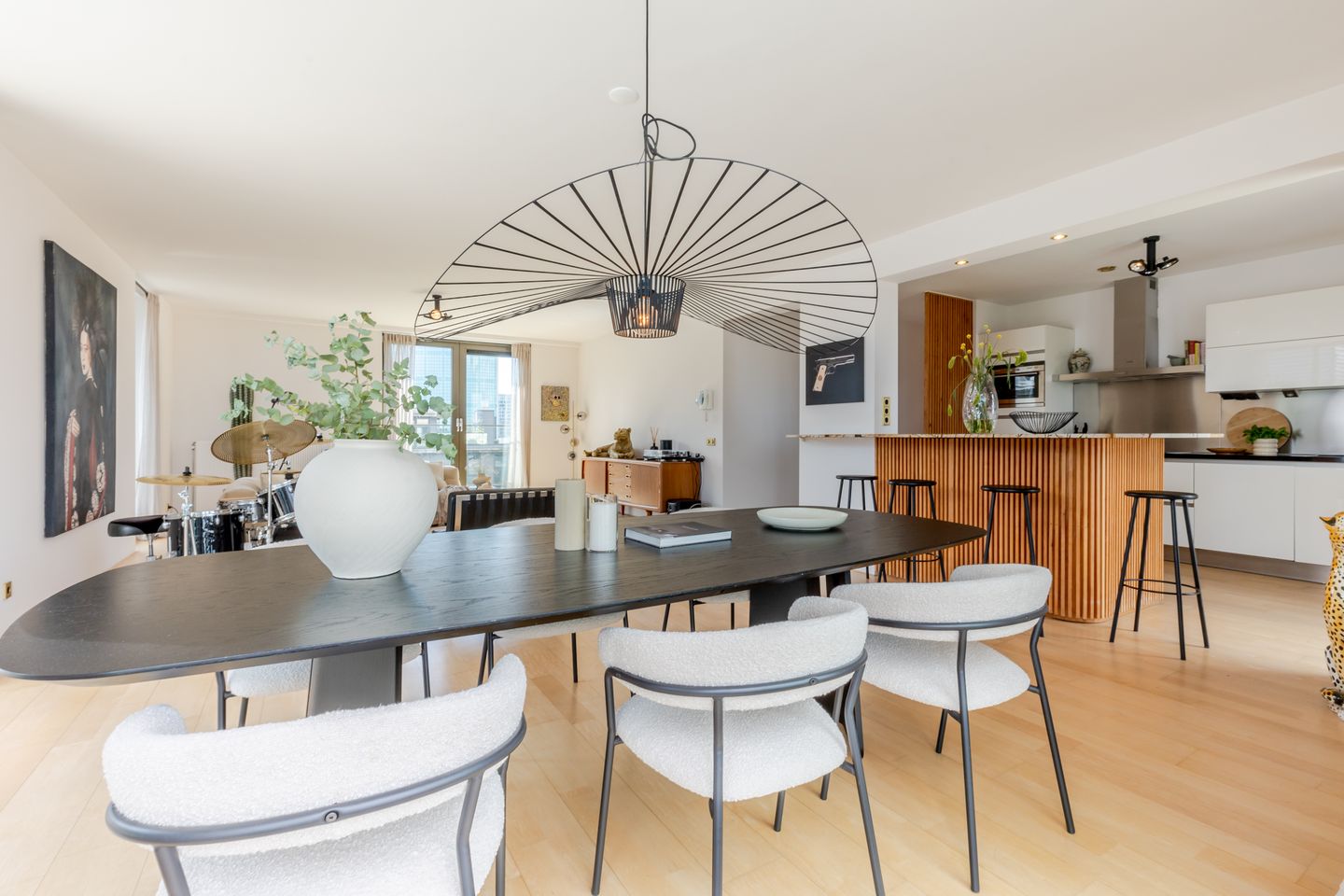 De moderne keuken heeft een eyecatcher van een eiland met bar en beschikt over veel kastruimte. Daarnaast bevindt zich in het keukenblok verschillende inbouwapparatuur zoals een inductiekookplaat, combi-oven, vaatwasser en koelkast. Een heerlijke plek voor een gezellige borrel met vrienden.