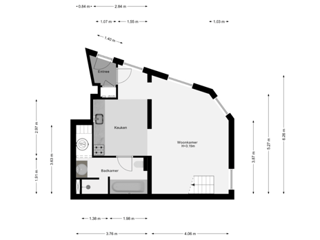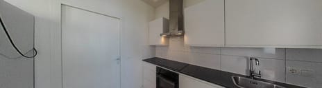 Je komt binnen in een verzorgde entree en stapt via de gang de woonkamer binnen. Meteen valt de prettige lichtinval op, dankzij het hoekraam en de hoge plafonds van ca. 3.15 m. De woonkamer, van ca. 6.25 x 4.00, voelt ruim en luchtig en vormt het hart van het huis. Aan de achterzijde ligt de moderne open keuken van ca. 3.75 x 2.40. Deze is strak afgewerkt met witte fronten, een donker werkblad en voorzien van inbouwapparatuur. Vanuit de keuken loop je door naar de verrassend ruime badkamer van ca. 3.65 x 1.90 met een ligbad, een aparte inloopdouche, een wastafelmeubel en toilet. Alles is modern uitgevoerd, in rustige kleurstelling en met een hoogwaardige afwerking.