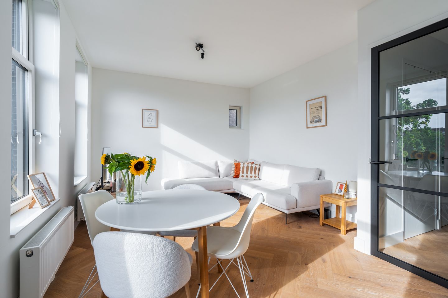Kom binnen in de entree die toegang geeft tot alle vertrekken op deze verdieping. Meteen valt de prachtige visgraatvloer op, samen met de stalen deuren met glas, wat de woning een luxe uitstraling geeft.