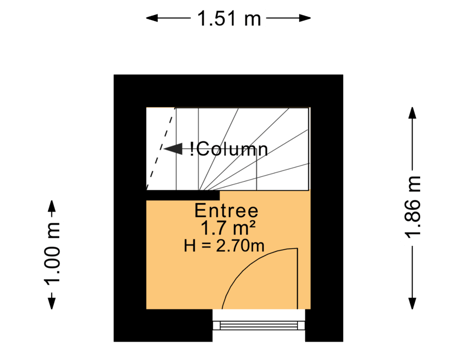 Bij binnenkomst kom je in een kleine hal, waar ruimte is om je jas op te hangen. Vanuit hier leidt een trap naar de tweede etage.