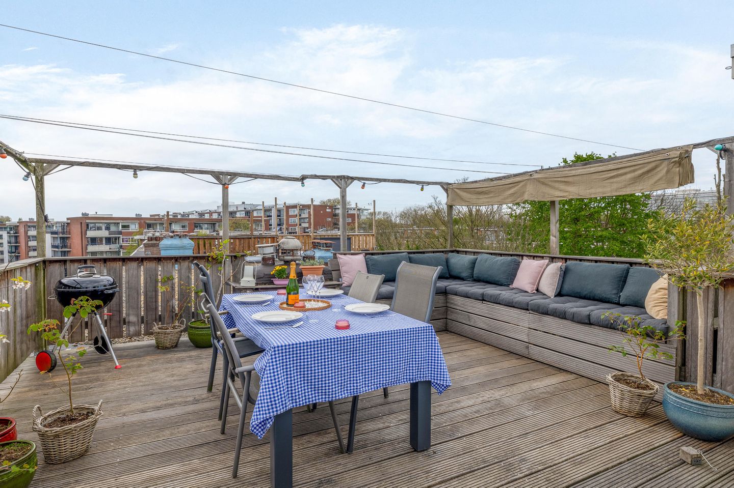 -Twee balkons op het zuiden én een royaal dakterras van ca. 25 m² met elektra, warm en koud water en unieke dakopbouw met kookvoorziening;