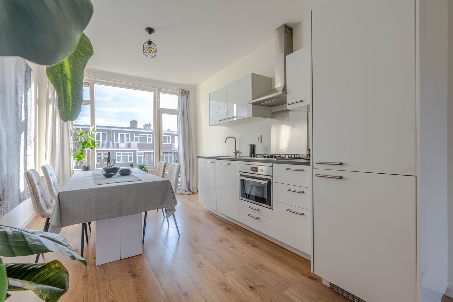 * Keukenruimte voorzien laminaatvloer, rechte inbouwkeuken met apparatuur: gasfornuis met combimagnetron, schouw-afzuigkap, vaatwasmachine en koel-vriescombinatie.
