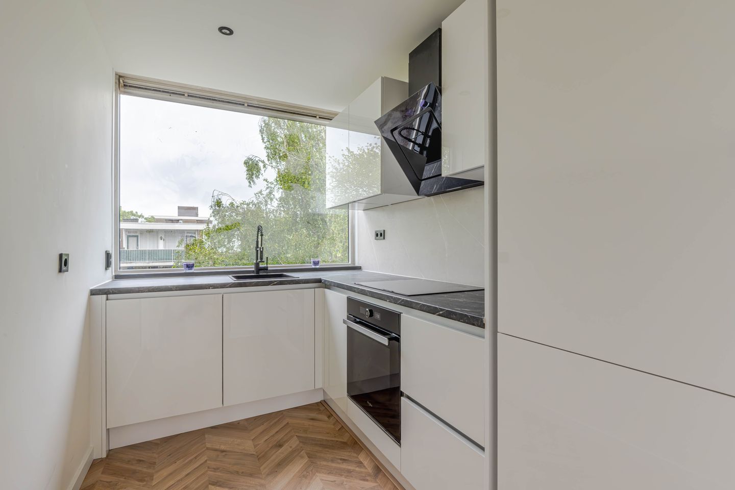 * Keuken voorzien van moderne hoekinbouwkeuken met apparatuur: inductiekookplaat, oven, koelvriescombinatie, vaatwasmachine en afzuigkap.