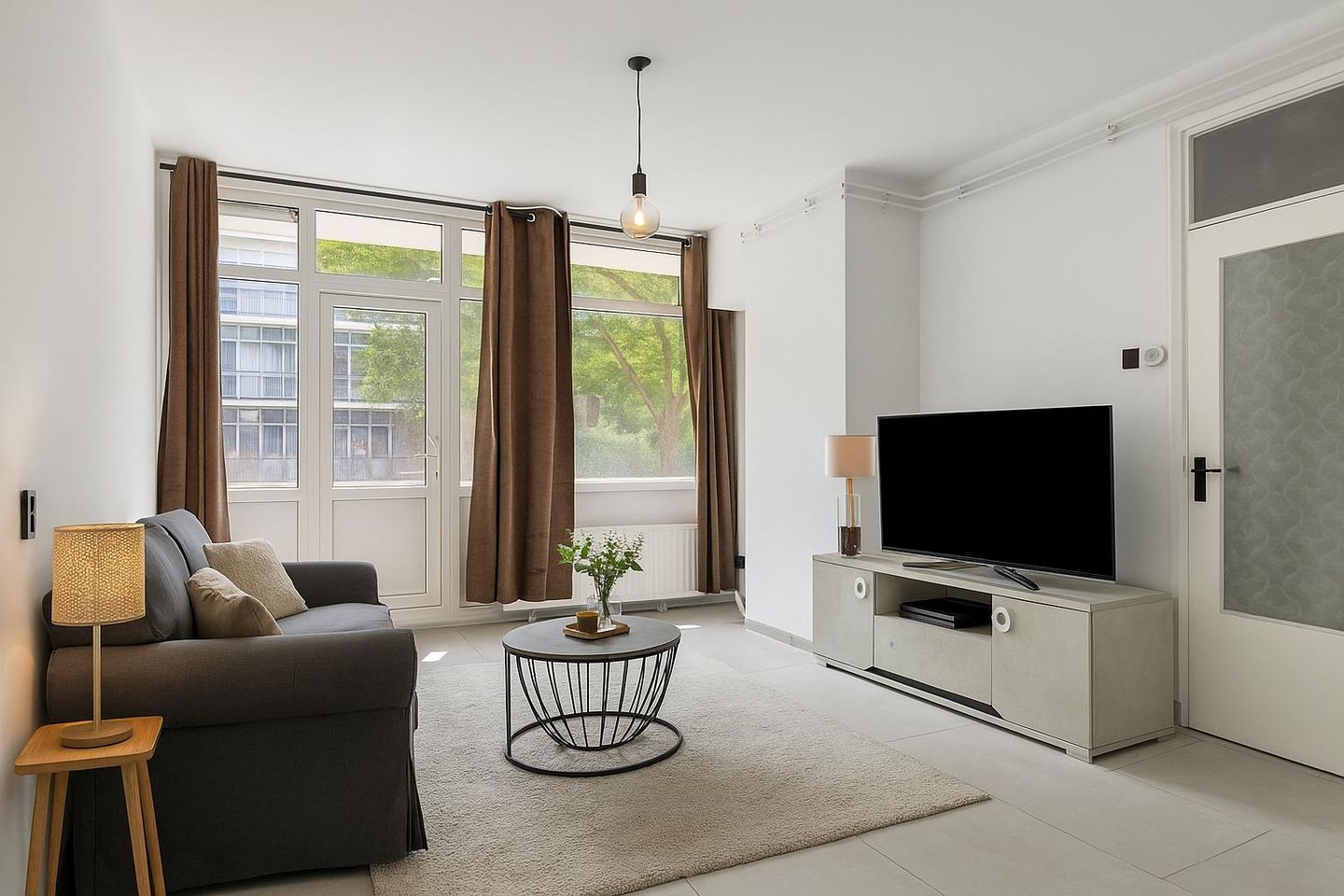 • Lichte woonkamer met grote raampartijen en toegang tot het balkon