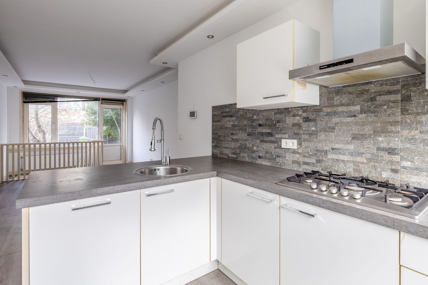 Je komt binnen op de begane grond, waar de woonkamer meteen opvalt door de prettige lichtinval en de open verbinding met de keuken. Dankzij de grote raampartijen aan de tuinzijde voelt deze leefruimte licht en open aan. Er is voldoende plek voor een comfortabele zithoek én een eettafel, waardoor dit echt een fijne plek is om thuis te komen na een lange dag. De open keuken sluit hier naadloos op aan en is praktisch ingericht, met voldoende werkruimte en kastruimte. Ideaal voor wie graag kookt en ondertussen contact houdt met gasten of huisgenoten.