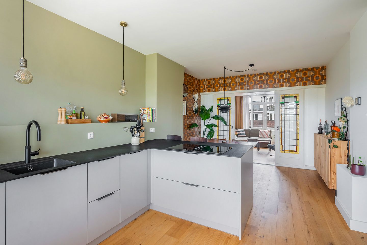 Binnenkomend in de hal valt direct de verzorgde afwerking op waaronder de prachtige houten vloer. Vanuit hier zijn de verschillende vertrekken toegankelijk, waaronder de moderne woonkeuken (2022). Een ware eyecatcher! Hier geniet je van een complete keukeninrichting die werkelijk aan niets ontbreekt: een kookplaat met geïntegreerde afzuiging, combi-oven, koelkast, vriezer, vaatwasser én een Quooker. Stuk voor stuk stijlvolle én functionele elementen die het koken tot een waar plezier maken. Bovendien biedt de L-vormige opstelling ruimte voor 2 barkrukken waardoor het koken goed gecombineerd kan worden met een gezellig borrel. Het aansluitende eetgedeelte nodigt uit tot lange avonden tafelen met familie en vrienden. Via prachtige en-suitedeuren met glas-in-lood loop je door naar de gezellige woonkamer. Een lichte, uitnodigende ruimte met een sfeervolle doorkijk naar het naastgelegen thuiskantoor en toegang tot het balkon. Dé plek voor je eerste kop koffie van de dag.