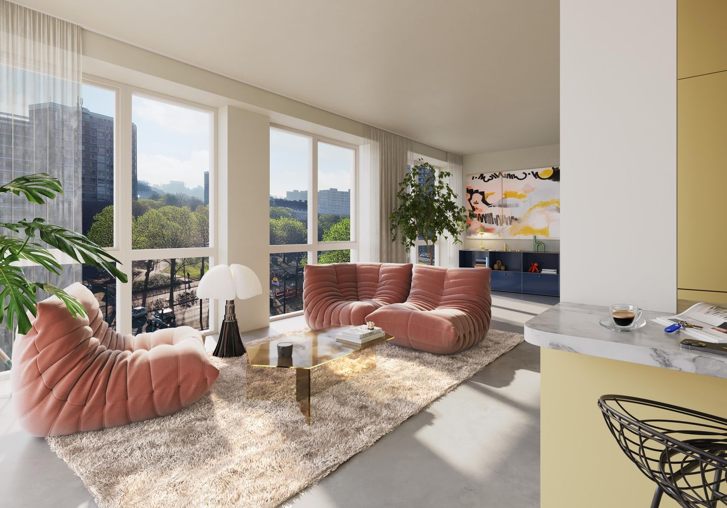 In de tweede plattegrond gaat alle aandacht uit naar het creëren van zo veel mogelijk ruimte voor de woonkamer. Die strekt zich in deze versie achter de glazen gevel uit over de gehele breedte van het appartement; meer zon- en daglicht in je woonkamer is ondenkbaar. De woonkamer reikt daarnaast bijna vijf meter diep richting de ietsje verscholen keuken en de slaapkamer. De inpandige slaapkamer die hierdoor ontstaat, sluit direct aan op de badkamer. En zo geniet je van wat extra luxe met een badkamer en suite.