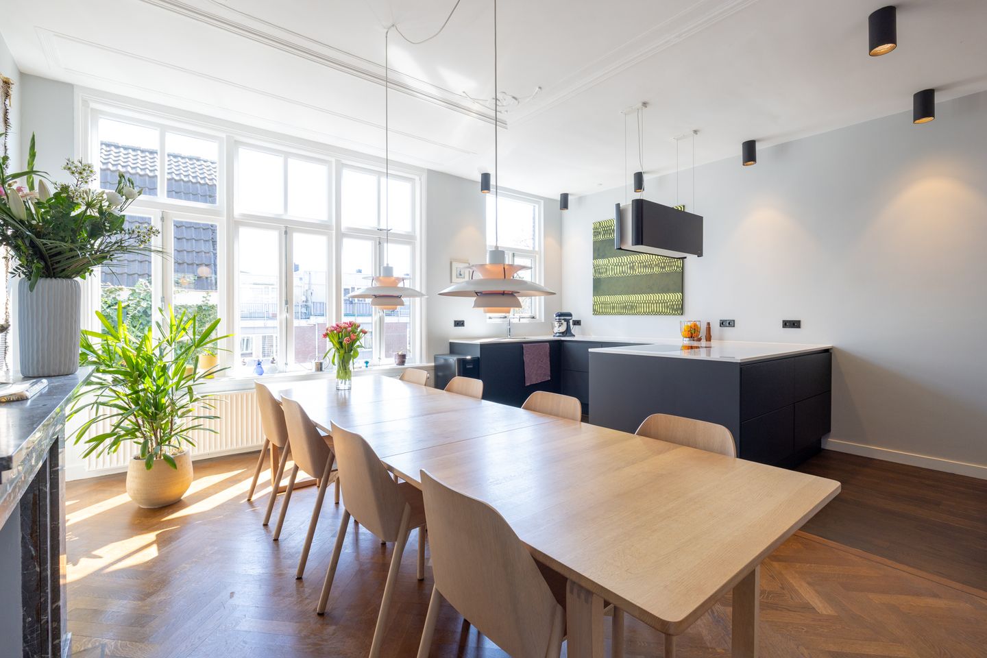 Set on plane tree-lined Graaf Florisstraat, this exceptionally elegant three-storey upper house offers approx. 207 sqm of refined space. Character details meet modern comfort: high ceilings, herringbone parquet, original features and high-end finishes—plus sustainable living with 7 solar panels. The International School is just around the corner.